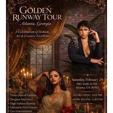 The Golden Runway Tour - Atlanta will be professionally filmed and officially aired on Amazon Prime Video! This is a major opportunity for all participating models, designers, and staff to gain global exposure on one of the world’s leading streaming platforms.